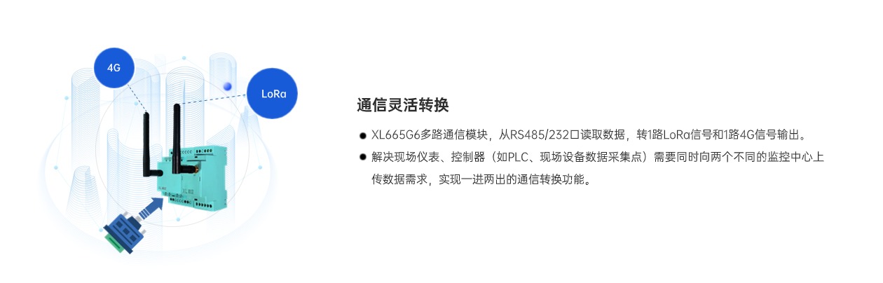 XL665G6多路通信模块是一款高效灵活的通信转换设备,可将RS485设备的一路输出信号,转为1路LoRa输出信号和1路4G输出信号,有效满足了工控设备同时将数据接入两个Modbus主站的需求,简单、方便、易用,成本更低,满足多种场景需求。